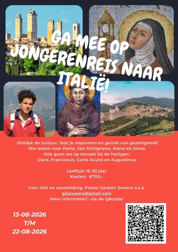 Pastor Gerben Zweers en pastoraal werkster Hedwig Mensink organiseren samen met een aantal andere jongeren een reis naar Italië. Dit wordt een hele mooie reis want die gaat naar een aantal bijzondere plaatsen. We zullen overnachten in Assisi. Dit prachtige middeleeuwse stadje is de plaats waar Franciscus leefde en werkte. Deze heilige is bekend om zijn eenvoud en hoe hij leefde met de natuur. Hij ligt hier begraven. Maar hij is niet de enige: ook de heilige Clara ligt hier begraven en ook de heilige Carlo Acutis. Carlo Acutis is een hele jonge heilige uit onze eeuw.